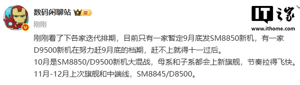 信息19 de Julio que博客@Digital Chat StationRevelóHoySus Horarios Para Cada una una de las nuevas llamadas iterativas。据说只有一个是在Sepcess结束时暂时安排了新的手机SM8850(暂定称为“第二代Snapdragon 8 Supreme Edition”)。 tengo un nuevoteléfonocelular d9500(Dimenity 9500)queestáTratandode ponerse aldíaa fines de septiembre。 si no puedes ponerte aldía,fendrásque irdespuésde 11个角色。此外,博客作者透露,十月是新的SM8850/D9500之间的斗争,母亲和子系列推出了新的旗舰。 noviembre-diciembre,laúltimaLíneaandignia y de rango medio,la sm8845/d8500。它已经注意到,高通您以前宣布下一次Snapdragon峰会将于9月23日至9月25日在夏威夷举行。 SM8750是高通Snapdragon 8 Supreme Edition(8 Elite),预计SM8850将是下一代SNapdragon 8 Supreme Edition。 Qualcomm内部列表包括Snapdragon 8 Supreme第二代版本(SM8850基本号)的两个版本。一个是由TSMC(编号8850-T)创建的3纳米版本,另一个是三星基于2纳米技术(第8850年)创建的版本。最新消息显示,高通公司不再区分版本,仅留下基本的SM8850型号,该型号被指定为TSMC生产的3纳米芯片。