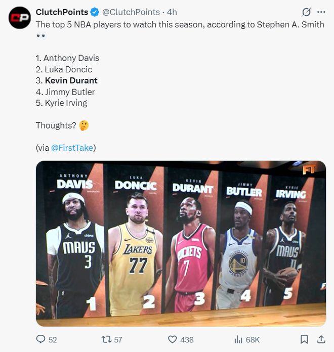 8月23日,北京时代,著名的歌手史蒂芬·史密斯(Stephen A. Smith)说,该计划的五名最佳运动员值得关注新赛季。即使在美国媒体的离合器点。 UU。史密斯认为他的评论是部分的。但是,摇滚迷一定会密切关注每个KD运动。数据媒体的参考预测表明,杜兰特(Durant)数据在25-26个赛季中的36分钟平均为25.6分,6.1个篮板,4.4次助攻和1.2钢,射门率为51.7%,三分球命中率为41.1%,罚球率为84.6%。 [37岁的杜兰特(Durant)在下一个赛季仍然有效而令人恐惧吗? Xu Xu Media写道:当杜兰特(Durant)到今年年底到37岁时,他对新赛季的预测数据仍然可以得到25.6分,51.7%/41.1%/84.6%的投篮命中率。杜兰特(Durant)上赛季的平均平均36.6分,26.6分,6个篮板,4.2次助攻,0.81钢和1.24个盖帽,发射率为52.7%,射门率为43%,任意球率为83.9%。数据是nOT与新季节的预测截然不同。 8月23日,媒体发送了ESPN对杜兰特合同续签的分析。许多专家认为杜兰特会削减薪水,并选择留在休斯顿。在本文中,休斯顿对KD的态度类似于湖人对LBJ的态度。他们不再是团队的第一核心。此外,火箭在选秀中建立的团队中有多个年轻核。杜兰特被认为是最后一个退伍军人难题。阿们和伊桑还需要面对更新问题。火箭应考虑未来的支付空间。如果杜兰特想留在休斯顿,他肯定必须接受比最高工资低的续期。