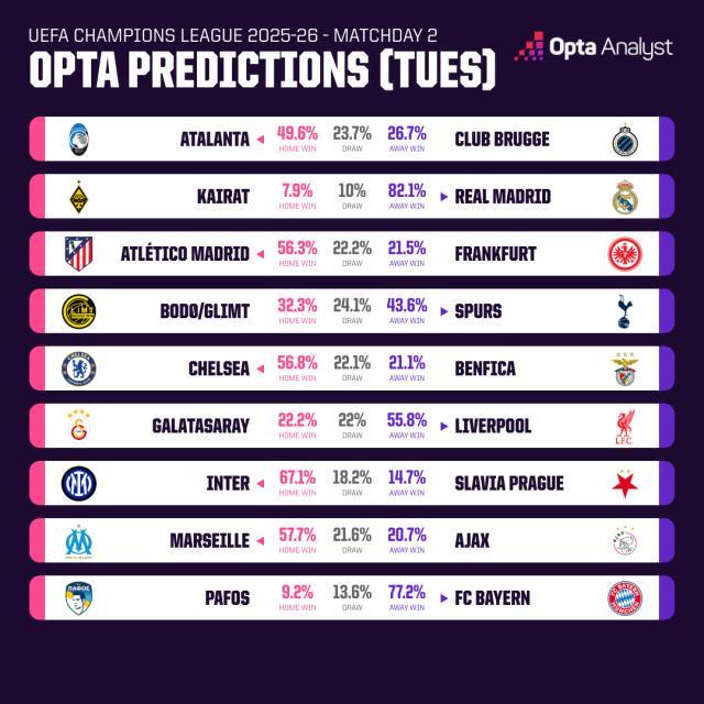 《体育周刊》所有媒体报道,冠军联赛的第二阶段将在今晚举行,总共有9场比赛,还有许多强大的强大球队,例如皇家马德里,拜仁,阿特西托·德·马德里和米兰,再次上台。但是总的来说,他并没有强调九场比赛中相同规模的两侧进行强烈的对话,但这就像“清晰的实力和劣势”。因此,由OPTA模拟估计的大多数竞争结果都是“单侧”。赢得超过70%的强大团队有两种可能性,有五场比赛不到70%,超过50%。最接近获胜机会的党是对托特纳姆热刺(43.6%)的Bordshin(32.3%)。这必须考虑到挪威团队拥有“魔鬼地方法院”的事实。然而,值得一提的是,托特纳姆热刺赢得了双重冠军,除了上个赛季欧罗巴联赛半决赛外,托特纳姆热刺赢得了双重冠军。他们没有去在寒冷的季节,板上的温度尚未降低。说到哈萨克冠军阿尔马斯·凯拉(Almath Keira)的优势,一定有一些。它的地理位置远非其在西欧的足球队。如果您要访问,那么导航的艰苦工作将不可避免地造成很多钱。因此,您认为想要飞行超过6,000公里的人皇家马德里会倒入战trench吗?特别是,他们带来了上周末以2-5失去马德里的厄运运气。有些人肯定正在等待看笑话,例如前俄罗斯国际阿尔沙文(Alshavin),他最近说:“当皇马失败时,我感到放心。”但是超级计算机并不真正相信皇马会失去积分。皇家马德里维多利亚的率模拟为82.1%,但领带和损失的可能性分别为10%和7.9%。在这个主题上,今晚将举行非常特别的比赛。切尔西面对本菲卡和穆里尼奥返回冠军联赛和斯坦福桥。比赛开始前,-nho谈到了“切尔西的最佳教练”。这样他就可以教授“妈妈”,他在最近的比赛中拿下1次输掉了3。老实说,切尔西最近一直在遭受内部和外部问题。不仅病变清单清单不仅清单,而且核心的PALER套餐和中央后卫不会发挥作用,而且我们将不得不担心利物浦在周末面临的英超联赛。但是有趣的是,在超级计算机评级下,本菲卡显然弱了,赢得一半的切尔西的机会少21.1%(56.8%)。这是因为葡萄牙超级联赛球队在第一轮输给卡拉巴赫吗?当然,网络财富是一种欢乐的跨度。这绝对不是真正的结果。星期三早上的比赛:00:45亚特兰大vs bruges00:45 almatikirat vs.皇家马德里03:00切尔西vs. benfica03:00 Atleticomadridv。法兰克福03:00慕尼黑
