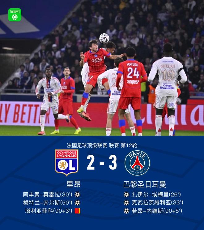 北京时间11月10日,法国足球联赛第十二轮比赛,里昂主场迎战巴黎圣日耳曼。上半场,维西尼亚助攻埃梅里大力射门破门。尼亚卡特长传助攻莫雷拉扳平比分。维西尼亚再次助攻KK进球。下半场,莫顿长传给奈尔斯助攻,并射门得分。塔利亚菲科吃到两张黄牌和一张红牌,被罚下场。补时阶段,李·甘伦开出角球助攻内维斯破门致胜。最终结果里昂2-3巴黎圣日耳曼。一场重要比赛第26分钟,维西尼亚送出精准长传,埃梅里小角度劲射破门。第30分钟里昂-巴黎0-1平!尼亚卡特长传助攻莫雷拉低射,里昂1-1巴黎。第33分钟,维西尼亚从后面断球并送出助攻。 KK 拥有 balGo 并进球!里昂-巴黎 1-2 第50分钟,莫顿长传萨斯从防守区起球,奈尔斯一脚高射入网。第90分钟和伤停补时第5分钟,里昂2-2巴黎获胜!李冈伦助攻内维斯角球头球破门,里昂2-3巴黎。两支球队的球员都参加了比赛。比赛还有 10 分钟就开始了。迈乌尔接到传中,头球攻门。第18分钟,巴黎再次头球攻门,但皮球仍然高出。第26分钟,维西尼亚送出精准长传,埃梅里小角度射门破门。第30分钟里昂-巴黎0-1平!尼亚卡特长传助攻莫雷拉低射,里昂1-1巴黎。第33分钟,维西尼亚从后面断球并送出助攻。 KK拿球并进球!第42分钟里昂-巴黎1-2,我们差点就走运了!塔利亚菲科的射门击中立柱。第50分钟,莫顿接防守区长传,奈尔斯一脚高射入网。里昂2-2帕里第61分钟,李冈伦内切射门,被格莱夫飞身单手扑出。第75分钟,内贝苏外围一脚远射,将球踢出。第79分钟,莫雷拉找准位置一脚抽射,射出高射炮。第89分钟,托利索摇头,攻门不费吹灰之力。骑士轻松没收了球。 90+5分钟,补时阶段胜利!李冈伦助攻内维斯开出角球并成功头球破门。里昂2-3巴黎比赛详细报道更新...球队阵容技术统计