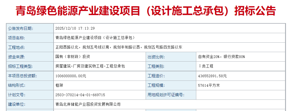 近日,青岛绿色能源产业建设项目(设计施工总承包)招标公告发布。项目地点位于正阳西路以北,规划5号...