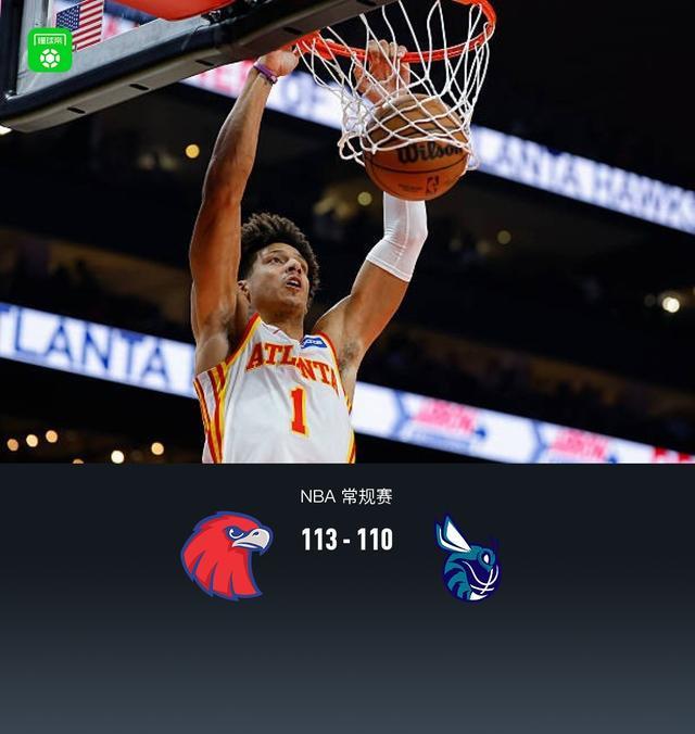 北京时间11月24日,NBA常规赛亚特兰大老鹰队对阵夏洛特黄蜂队。半场老鹰53-55领先黄蜂,最终老鹰113-110领先黄蜂。亚特兰大老鹰队贾伦·约翰逊得到28分、8个篮板和11次助攻,亚历山大·沃克得到23分、5个篮板和4次助攻。夏洛特黄蜂队的努佩尔得到28分、6个篮板和3次助攻,塞克斯顿得到22分和4次助攻。第一节,老鹰队的贾伦·约翰逊拿下7分,黄蜂队的塞克斯顿拿下9分。首节战罢,老鹰28-25领先黄蜂。第二节,老鹰队的贾伦·约翰逊得到9分,黄蜂队的K·J·辛普森得到5分。半场结束,老鹰53-55领先黄蜂。第三节,老鹰队的亚历山大·沃克得到12分,黄蜂队的迈尔斯·布里奇斯得到11分。第三节结束,老鹰92-88领先黄蜂。第四节,老鹰队伊森·邓恩·尼尔斯得到6分,黄蜂队的努佩尔得到9分。最终,老鹰以113-110击败黄蜂。全场数据:贾伦·约翰逊为亚特兰大老鹰队拿下28分、8个篮板、11次助攻和1次抢断。亚历山大·沃克得到23分和5次抢断。戴森丹尼尔斯得到22分、9个篮板、6次助攻、2次抢断、4次助攻、1次抢断、1次盖帽。夏洛特黄蜂队的努佩尔得到28分、6个篮板、3次助攻和1次盖帽,塞克斯顿得到22分和4次助攻,迈尔斯·布里奇斯得到21分、5个篮板、5次助攻、1次抢断和1次盖帽。亚特兰大老鹰首发阵容:贾伦·约翰逊、亚历山大·沃克、戴森·丹尼尔斯、奥孔古、丽莎·西;夏洛特黄蜂队:纳珀、塞克斯顿、迈尔斯·布里奇斯、肖恩·詹姆斯、普拉姆利。
