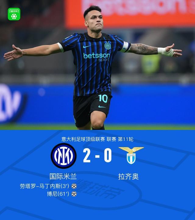 北京时间11月10日,意大利足球甲级联赛第11轮比赛,国际米兰主场迎战拉齐奥。劳塔罗在上半场前三分钟打入闪电进球。扎卡尼的远射造成了危险。苏蒂奇错过了一个机会。下半场,博尼射门扩大比分。泽林斯基的低射被判无效。最终,国米2-0击败拉齐奥,全取三分。关键事件:3分钟比赛,梦幻开局。第3分钟劳塔罗抽射破门。国际米兰1-0拉齐奥。第61分钟,迪马科左路送出传中,博尼门前推射破门。国际米兰2-0拉齐奥。两支球队的球员都参加了比赛。比赛马上就要开始了。比赛开始3分钟,梦想的开始。第3分钟,劳塔罗抽射破门。破门,国际米兰1-0拉齐奥。第9分钟,迪马科获得任意球。劳塔罗高高地冲向该地区。第18分钟,扎卡尼内切他向左侧远射。我把球击得有点高。第25分钟,巴雷拉右路传中。苏契奇左路抽射突破。第26分钟,拉齐奥主帅萨里对判罚不满,吃到黄牌。第29分钟,阿坎吉禁区前抽射,皮球险些偏出球门。第33分钟,阿坎吉放倒攻击手扎卡尼吃到黄牌。第51分钟,邓弗里斯从背后放倒扎卡尼,裁判向其出示黄牌。第52分钟,古恩多齐禁区外抽射,但索默将球没收。第56分钟,泽林斯基和奥古斯托换下苏西奇和邓弗里斯。第57分钟,劳塔罗禁区中央抽射,但皮球未能被遏制。第61分钟,迪马科左路传中,博纳门前射门。国际米兰2-0拉齐奥。第67分钟,泽林斯基禁区外低射破门,迪马科手球率先被判无效。第71分钟,图拉姆换下劳塔罗。第74分钟,佩德罗禁区外左脚射门攻入远角。球稍稍偏出。第77分钟,拉齐奥禁区内任意球头球攻门,皮球击中立柱。第79分钟,奥古斯托小角度抽射被门将扑出。球队阵容的技术统计。